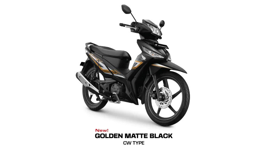 Menjadi salah satu model motor bebek terlaris di Indonesia, Honda Supra X 125 tipe Cast Wheel (CW) hadir dengan pilihan varian warna baru yakni Golden Matte Black. Varian warna baru ini memadukan warna hitam yang dibalut dengan stripe berwarna gold di atas desain bodi yang ramping dan sporti, sehingga memberikan kesan mewah bagi para penggunanya. Paduan warna tersebut kini semakin lengkap dengan hadirnya desain stripe bergaya sporti melalui penyematan grafis tajam dan minimalis yang dipadukan dengan warna bodi sepeda motor.